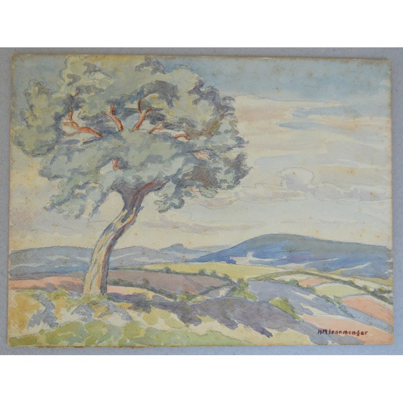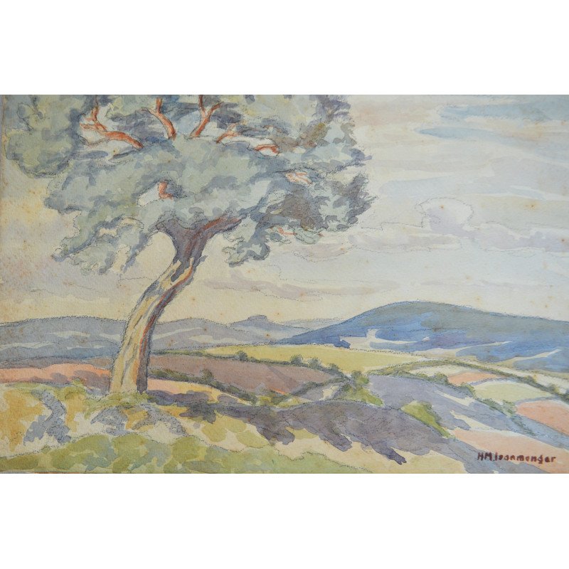 H M Ironmonger Peisaj acuarela veche pe carton.