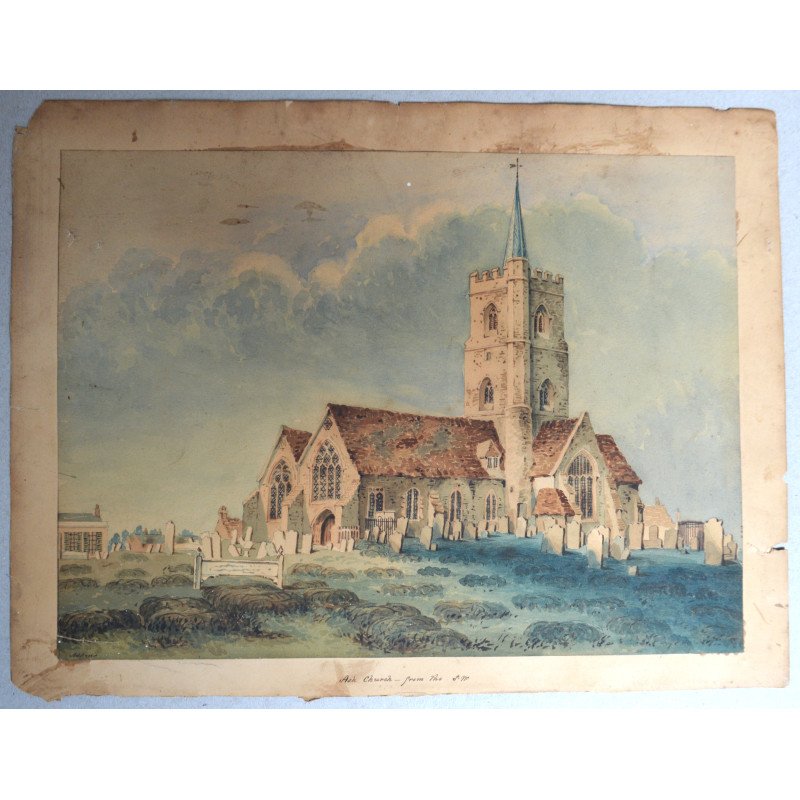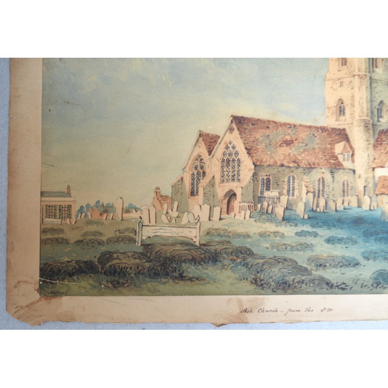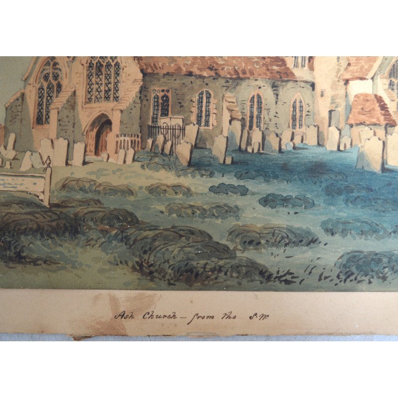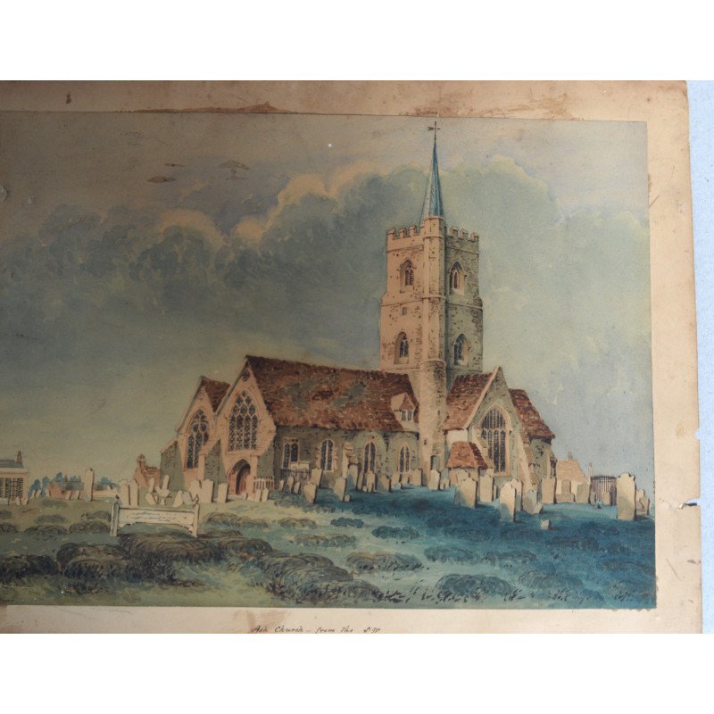 "Ash Church" acuarela veche, Anglia, sec 19.