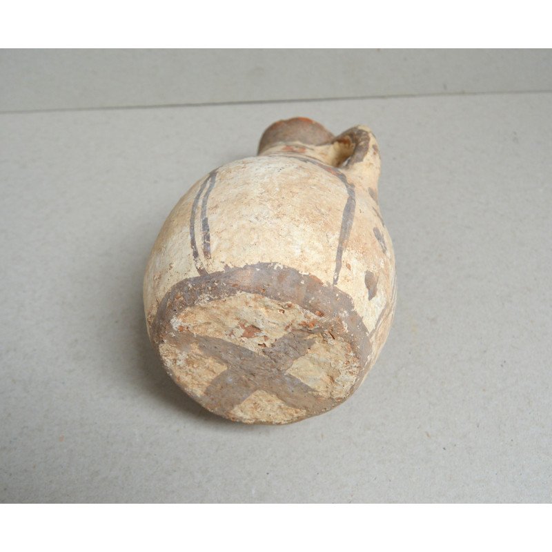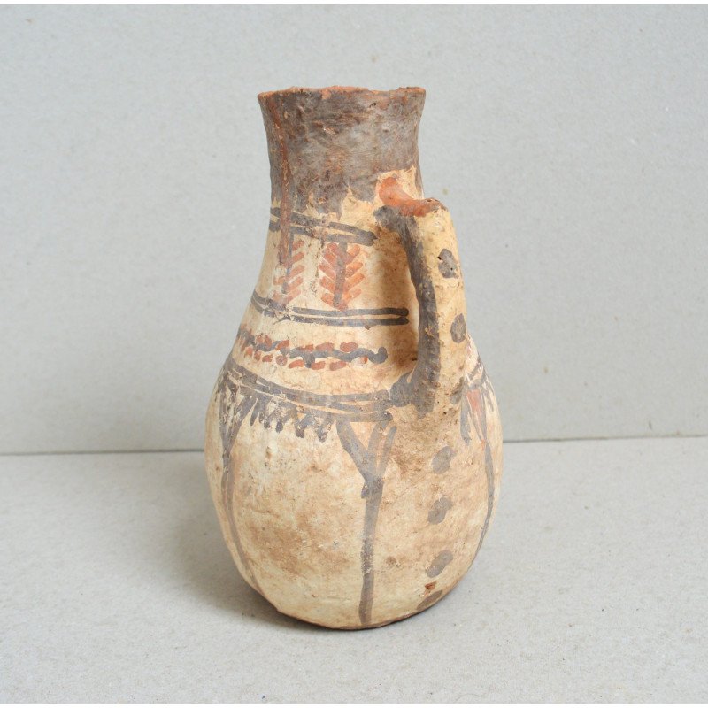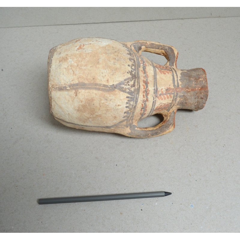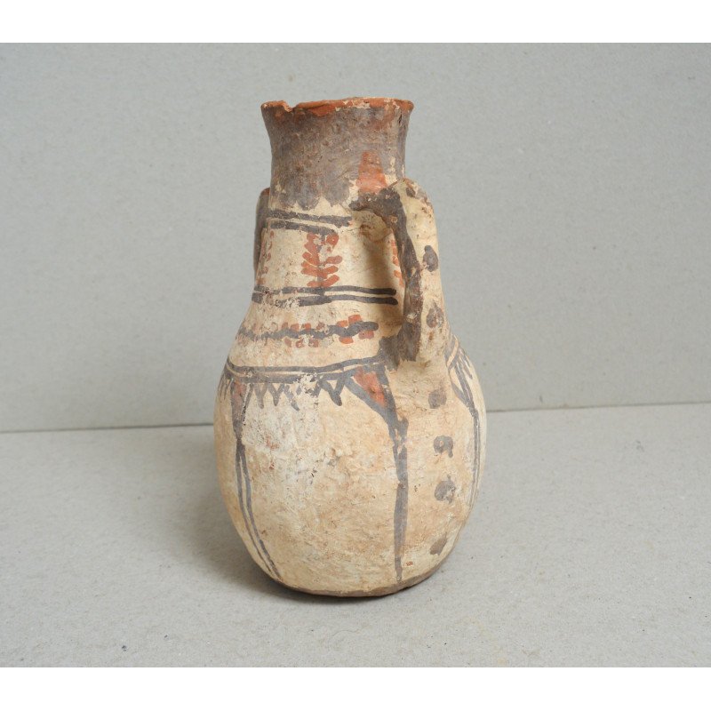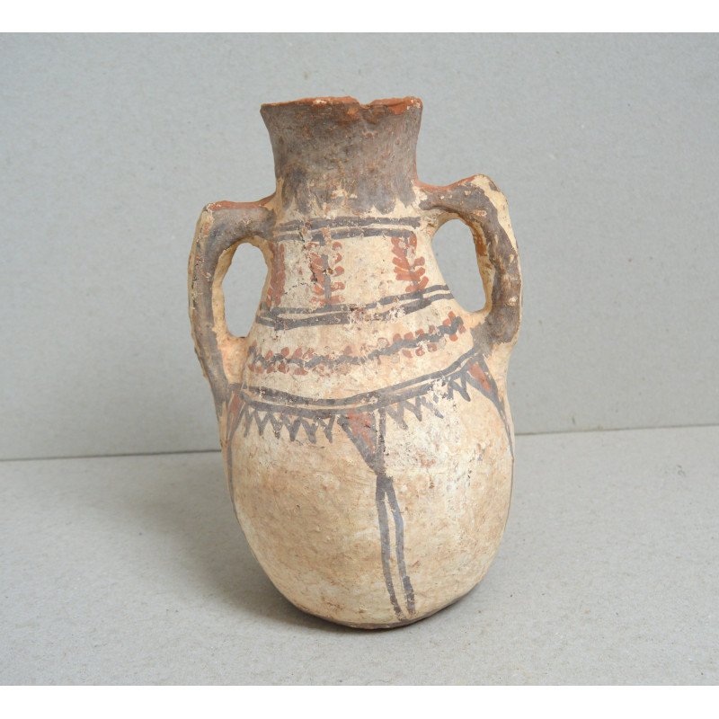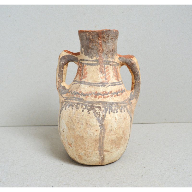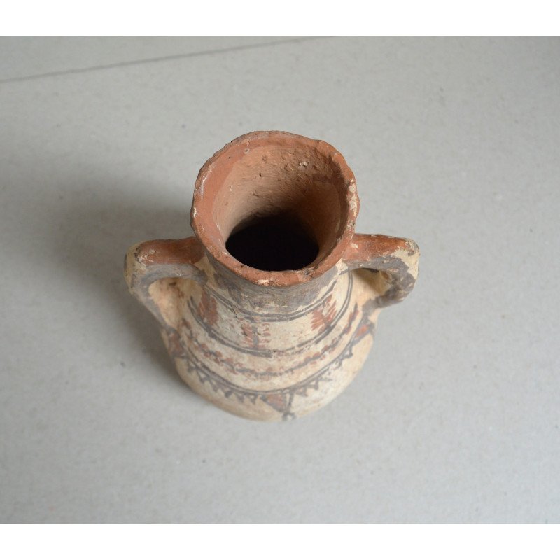 Vas de uz domestic, lucrat manual, cu corp rotund și gât înalt, prevăzut cu două torți dispuse simetric, ce leagă umărul vasului de zona superioară a gâtului. Vasul este realizat dintr-o pastă poroasă, de culoare ocru-gălbuie, specifică ceramicii utilitare nord-africane, și este decorat cu motive geometrice pictate în roșu brun și negru. Ornamentica, dispusă în registre orizontale pe partea superioară a corpului, constă în benzi paralele, linii în zigzag, serii de puncte și motive de tip ramificat (simboluri vegetale stilizate).