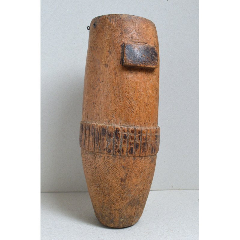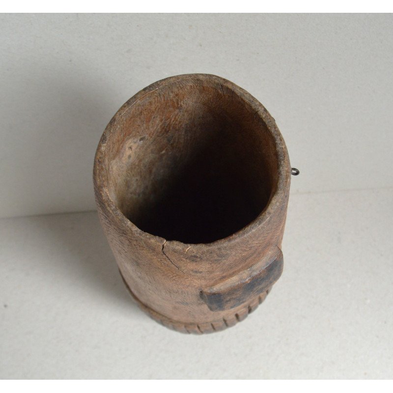 Lemnul prezintă o patină consistentă, indicând o utilizare practică îndelungată, dar și o bună conservare generală. Interiorul este adânc ceea ce sugerează folosirea pentru păstrarea lichidelor sau cerealelor.
