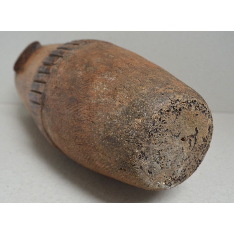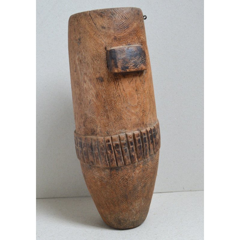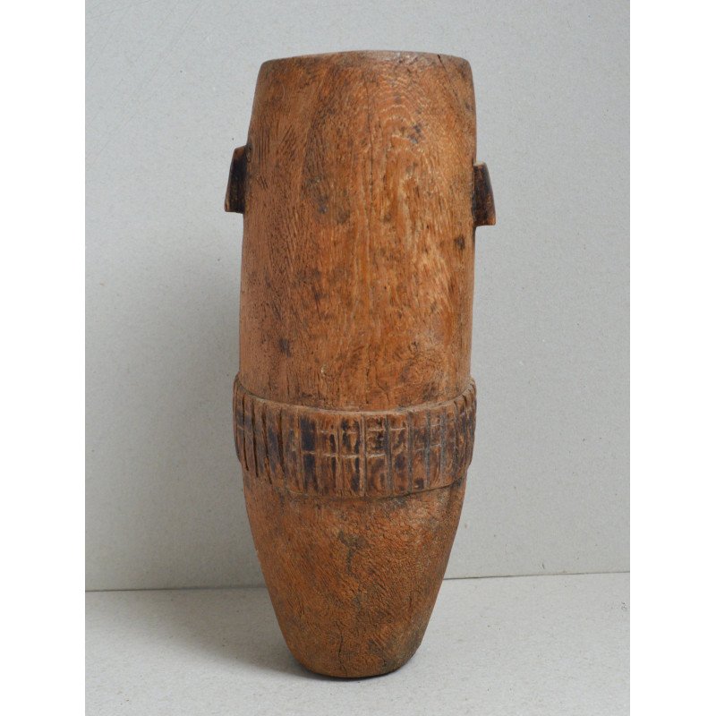 Obiect tradițional african din lemn masiv, lucrat manual de către un meșteșugar din Kenya, cel mai probabil dintr-un trib din zona centrală sau sudică (Kikuyu, Meru sau Kamba). Piesa are o formă ovoidală alungită,, două torți laterale (pentru suspendare sau transport) și un brâu median decorativ, sculptat în relief cu ritmuri verticale. Acest brâu este atât element funcțional (pentru întărirea structurii), cât și decorativ.