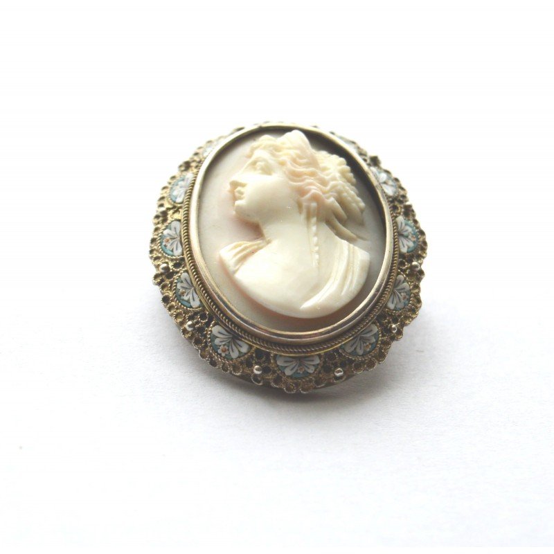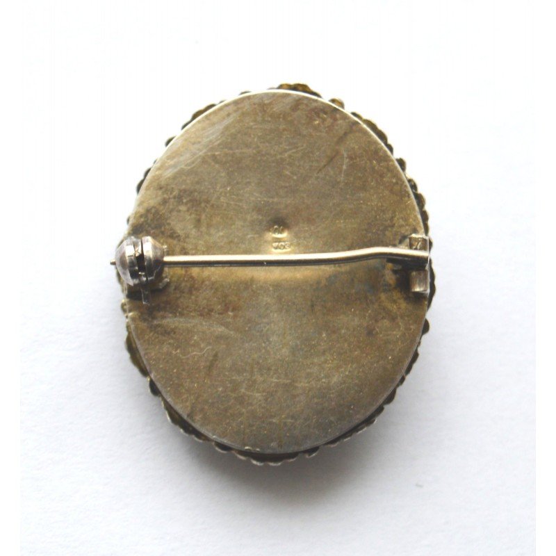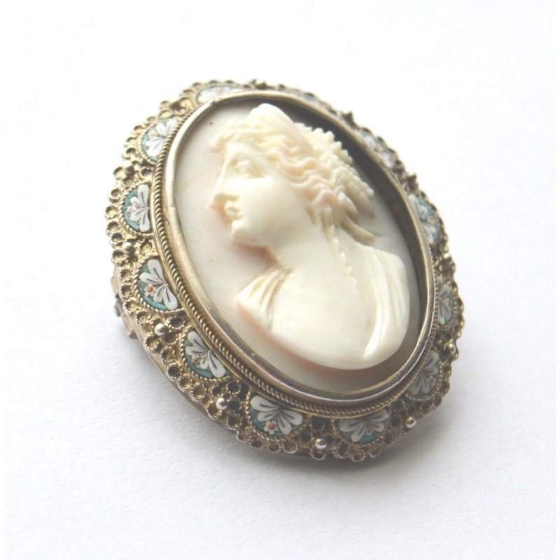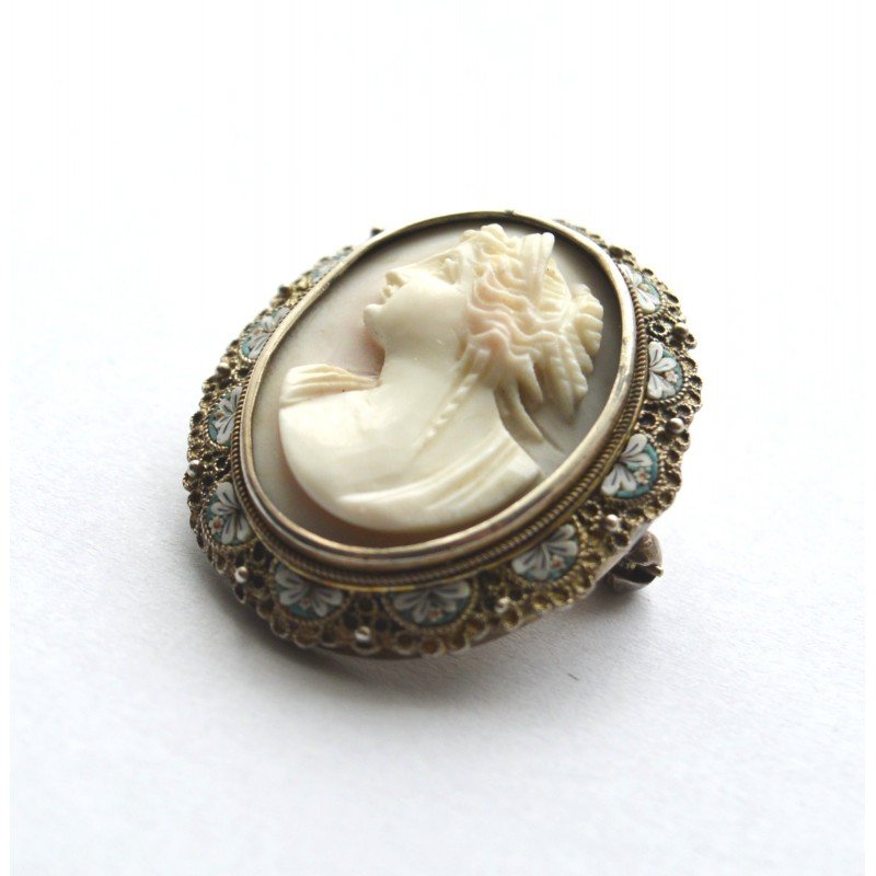 Brosa veche argint cu micromosaic italian si camee coral alb, marcaj 800 EOA