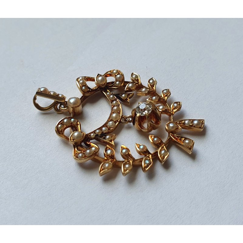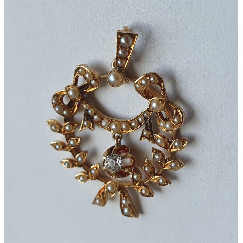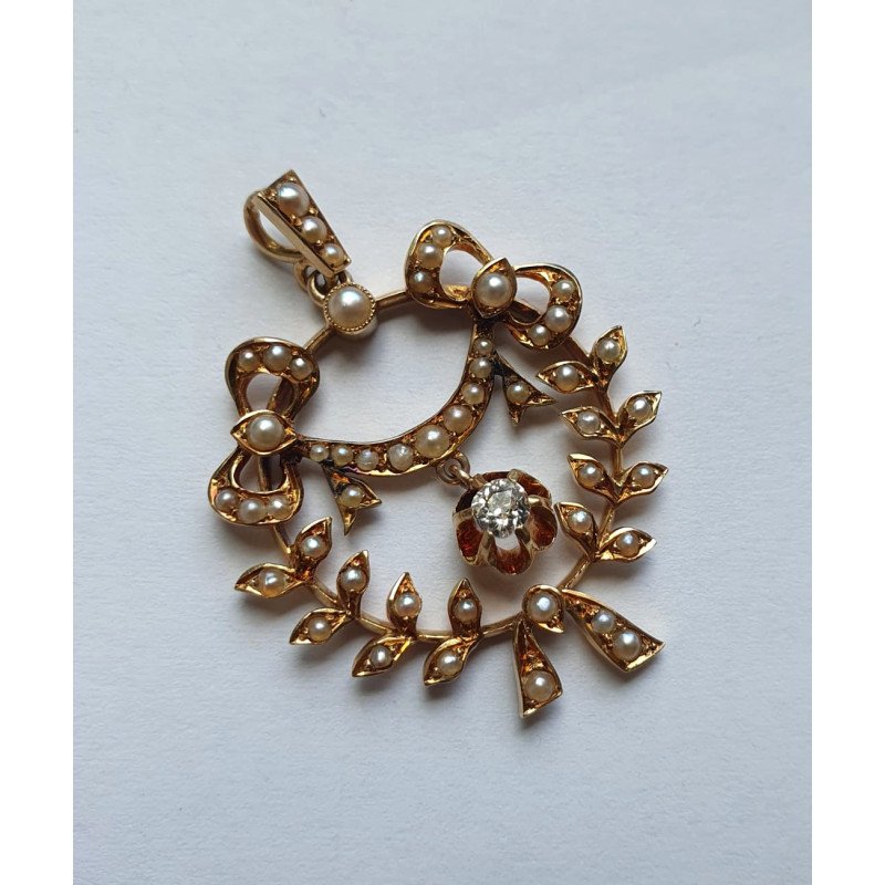 Pandantivul este decorat cu 49 perlute naturale si prezinta central un diamant cu diametrul de 3 mm