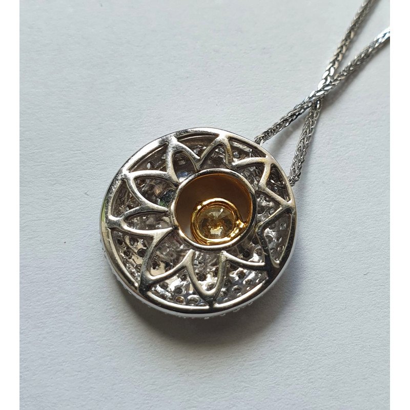 Pandantivul este decorat central cu un diamant briliant de 4 mm diametru, culoare fancy champagne. Acesta este inconjurat de un pave de diamante briliant incolore. Total diamante aproximativ 0.85 carate