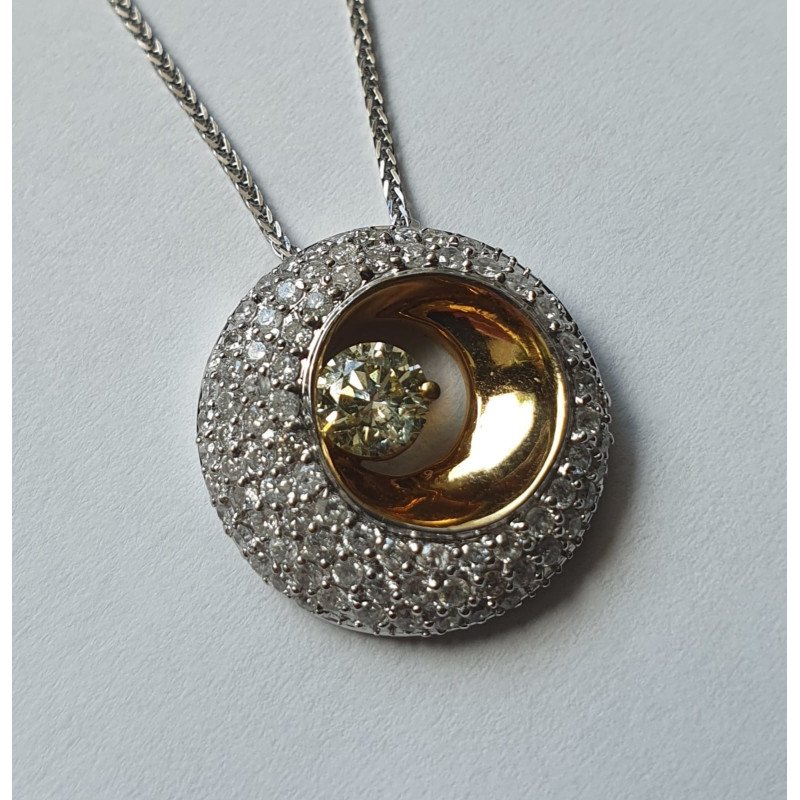 Set format din lant aur alb 18k si pandantiv aur alb si galben 18k. Lantul prezinta marcaj ITALY 750 si marcaj ANPC. Pandantivul prezinta marcaj 750, testat si confirmat ANPC.