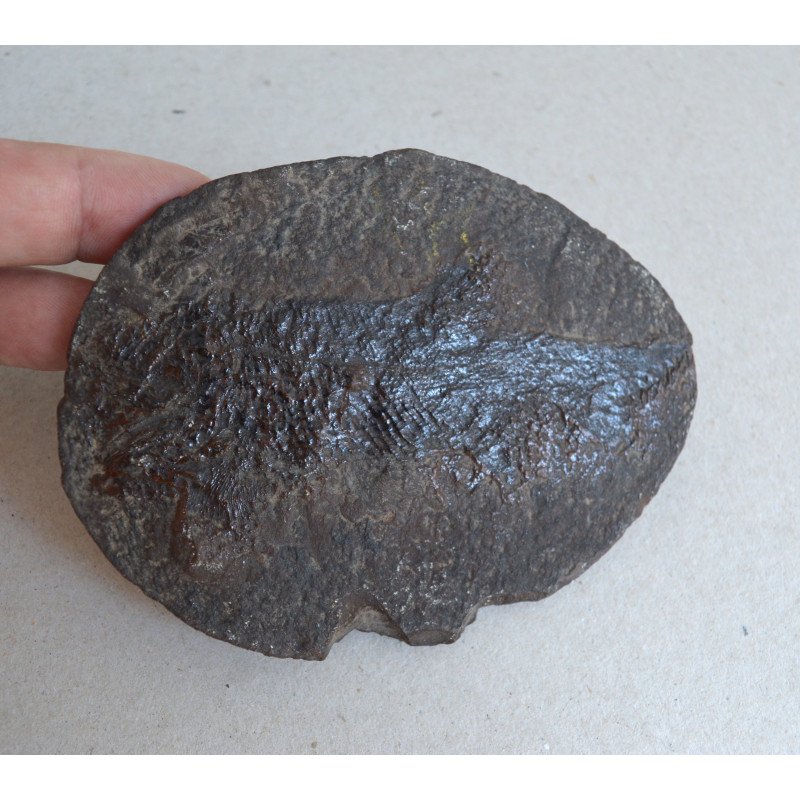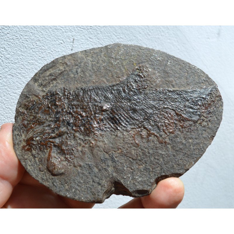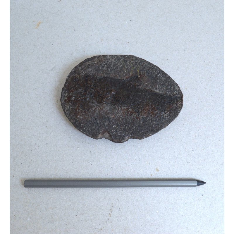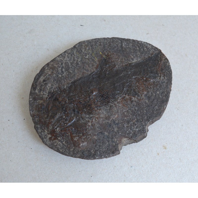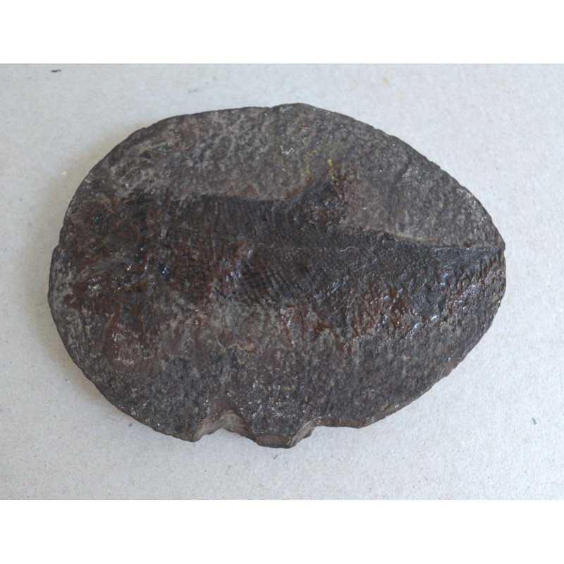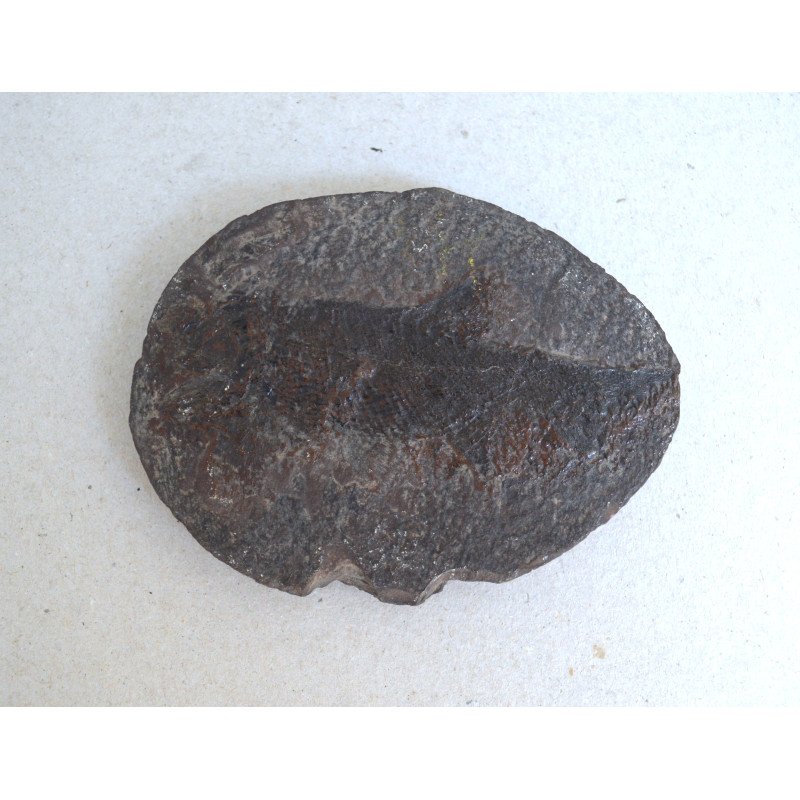 - Fosilă de pește conservată lateral, cu un corp fusiform.
