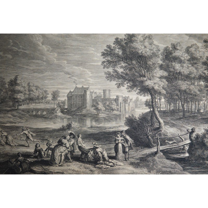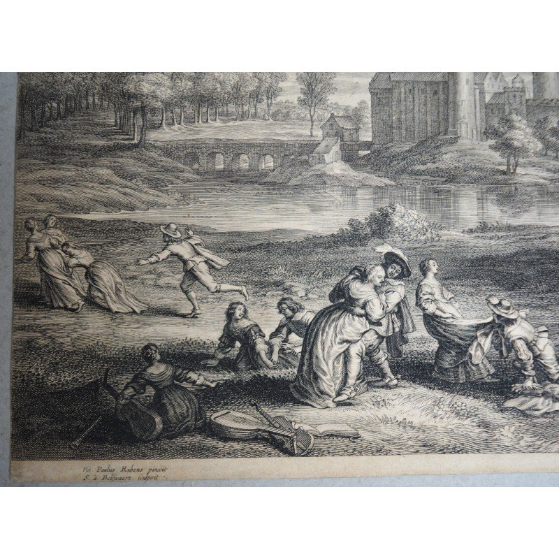 DescriptionThe park of a castle; couples playing on the grass in foreground, a girl with musical instruments in lower left, beyond is a castle surrounded by a moat; later state with number; after Peter Paul Rubens.