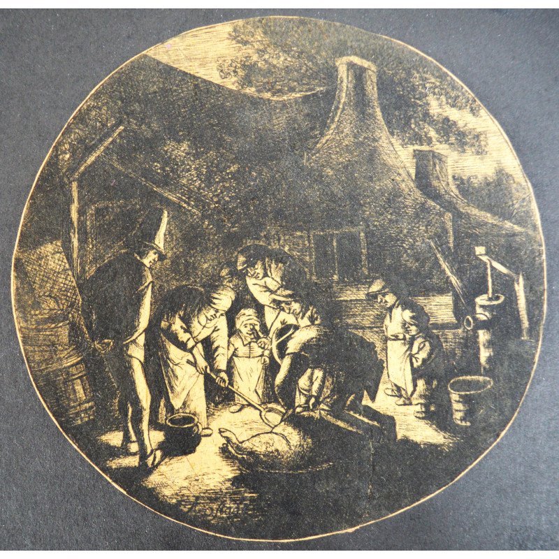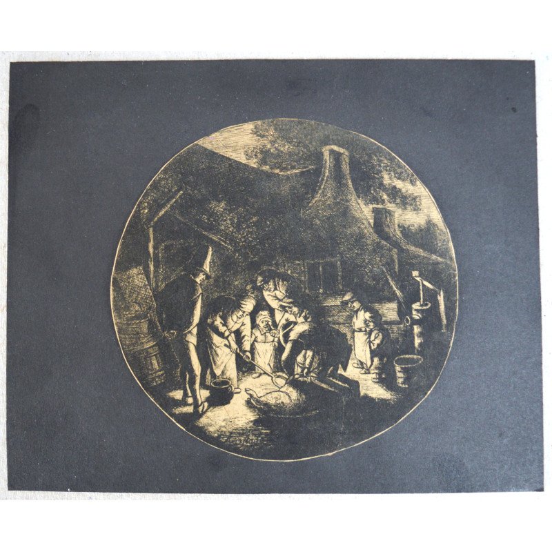 DescriptionThe Pigkillers. Night scene with a group of peasants standing at centre, and watching a pig being slaughtered by a man who kneels on its flank, a woman holding a pan ready to receive the entrails; in a circle; copy in same direction after Adriaen van Ostade's etching. c.1782-1803