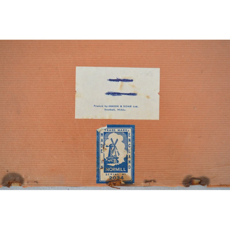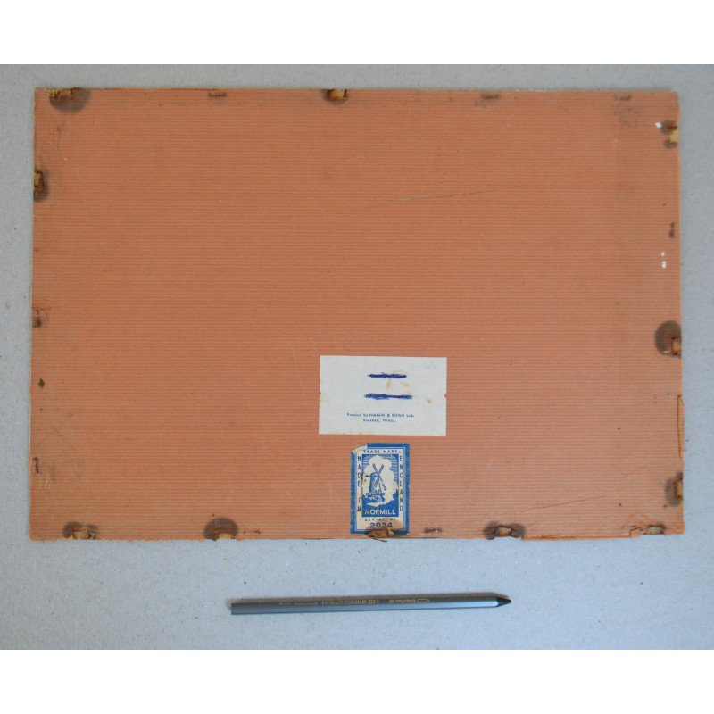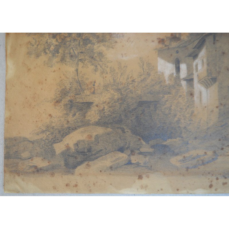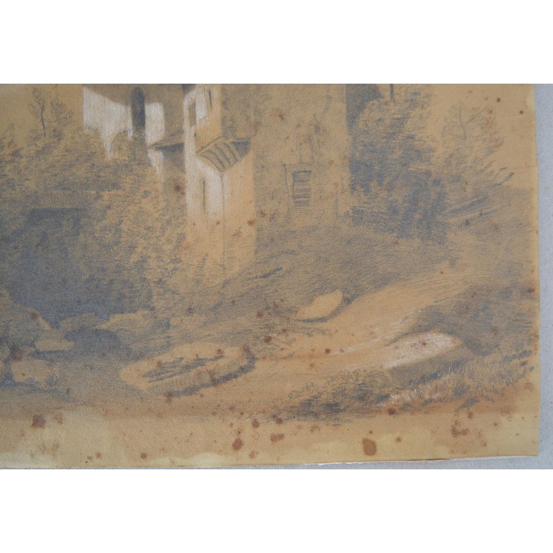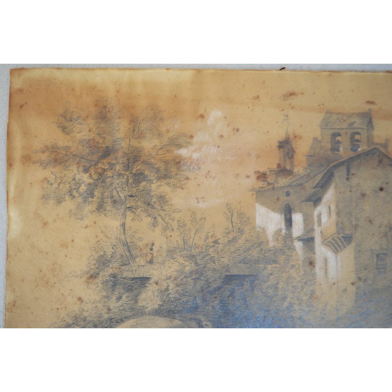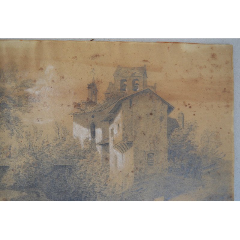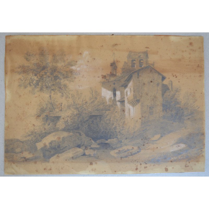 Peisaj cu biserica desen vechi pe hartie prinsa pe un suport de carton.