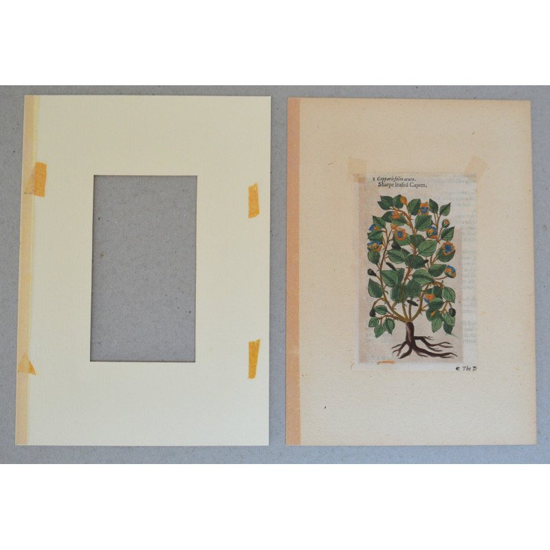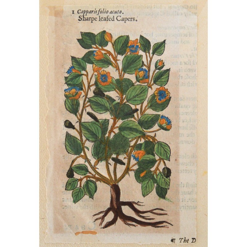 John Gerard "Capparis folio acuto" xilogravura colorata manual, din "The herball or Generall historie of plantes" , Londra, 1597.