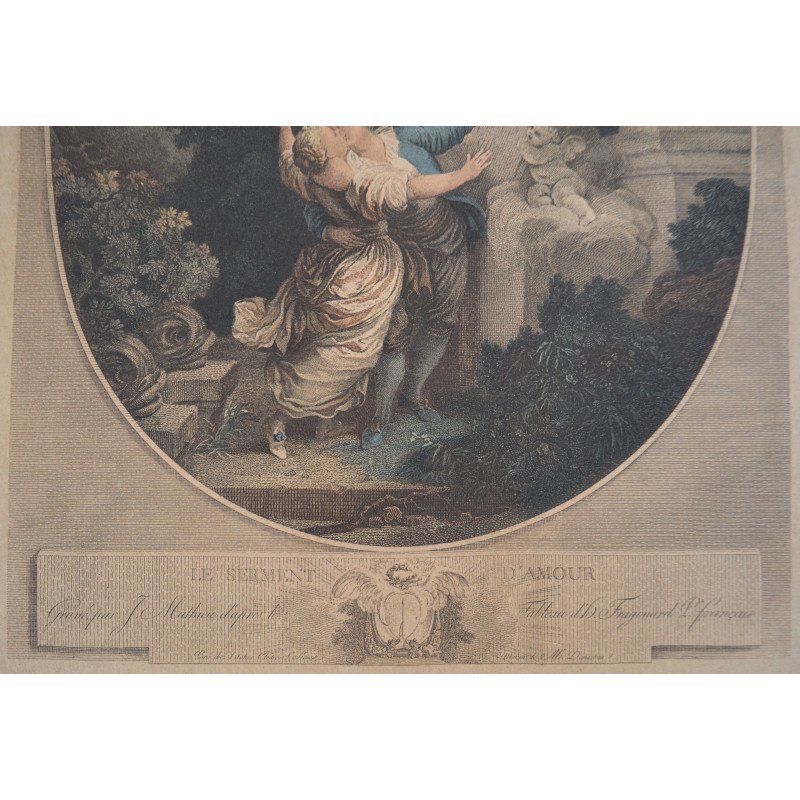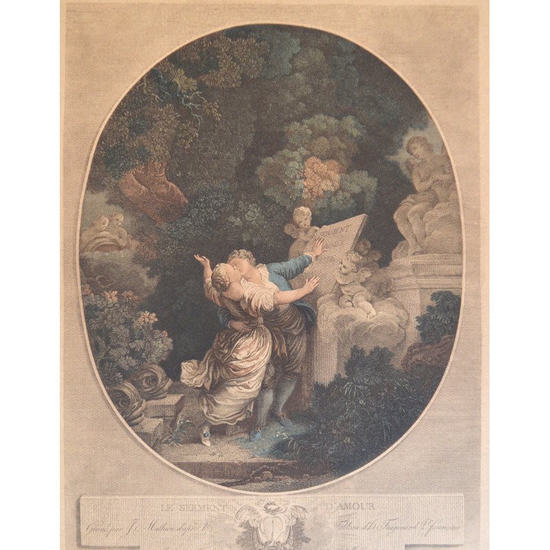 Jean-Honoré Fragonard "Le Serment D'Amour" gravura veche pe carton, colorata manual, 1786