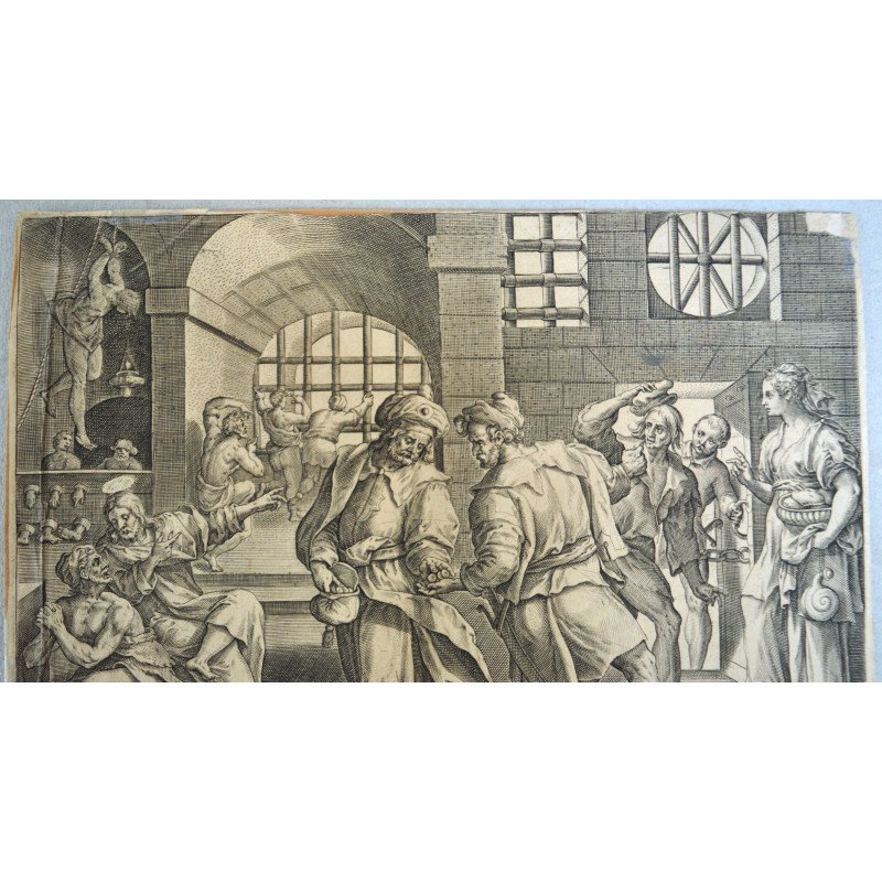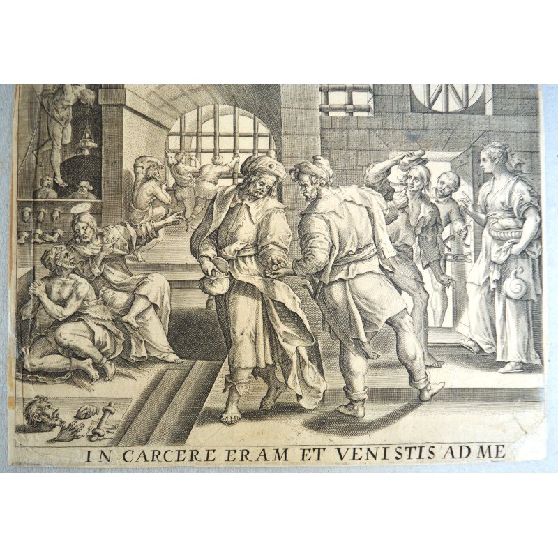 Visiting prisoners with Christ looking on; a prison with a man paying a jailer at centre; Christ seen seated to left, talking with a prisoner; behind, a torture scene; to right, a woman bearing food and drink to the captives; on full sheet; after Maarten de Vos.
