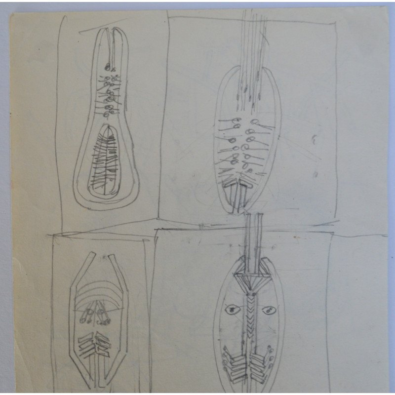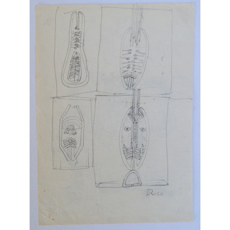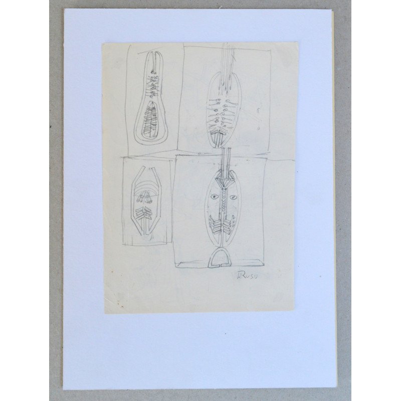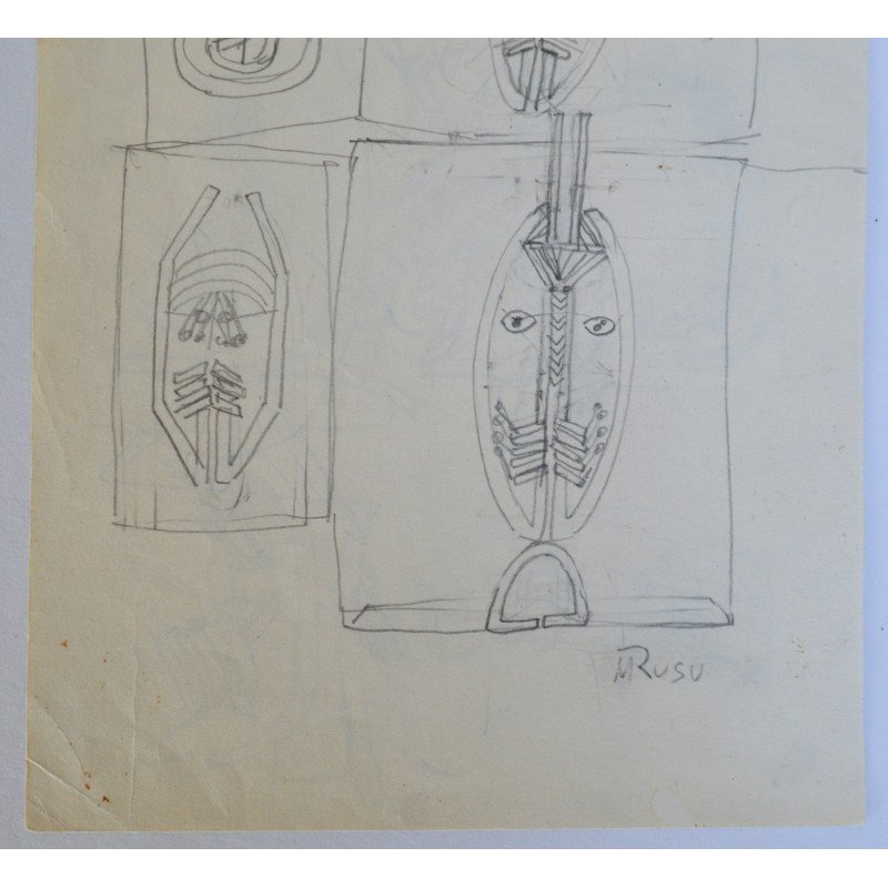 Mihai Rusu "Masti" desen in creion pe hartie fixata pe un suport de carton.