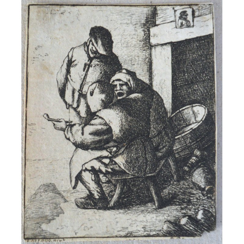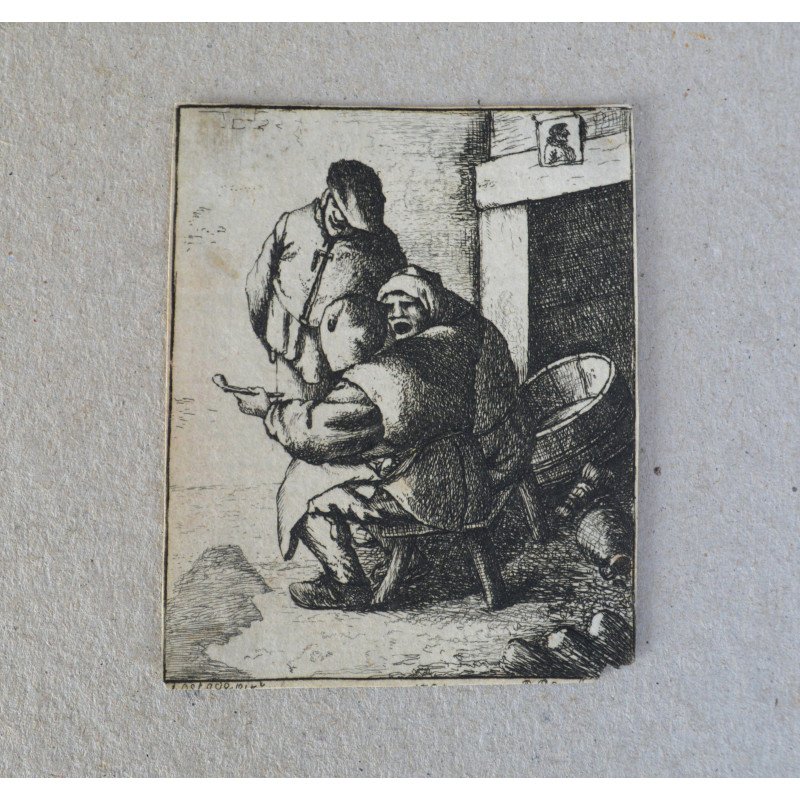 Gravura veche scena de taverna pe hartie manuala.