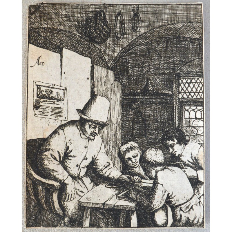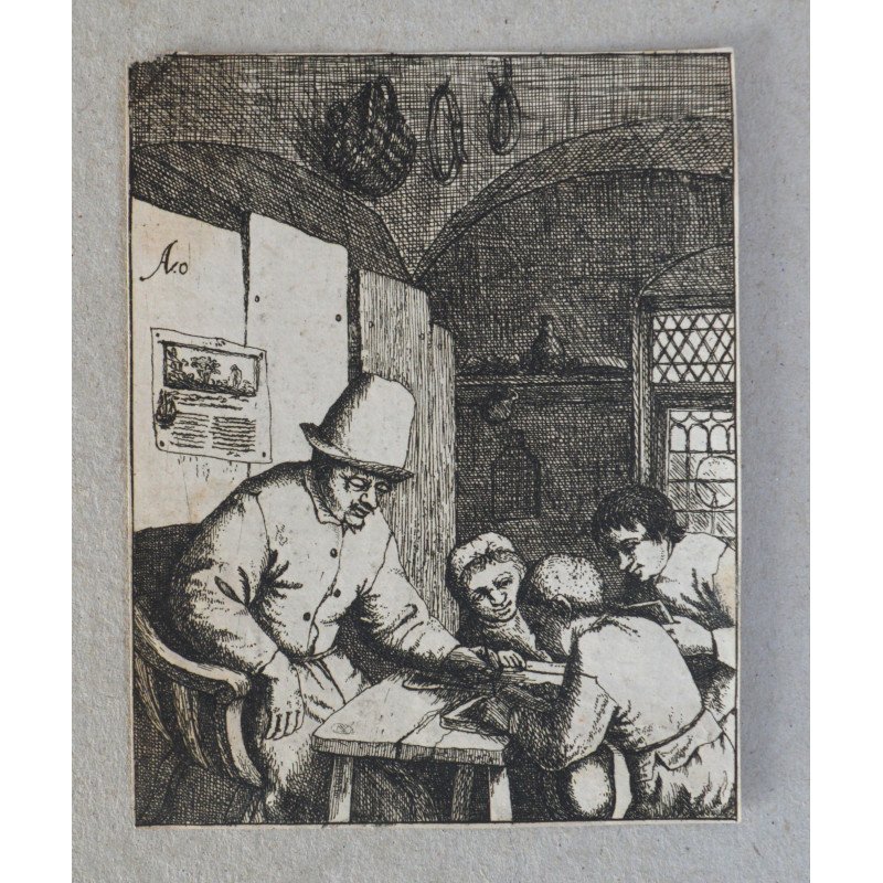 DescriptionA schoolmaster seated at a table with his three pupils; copy in same direction after Adriaen van Ostade's etching. c.1782-1803