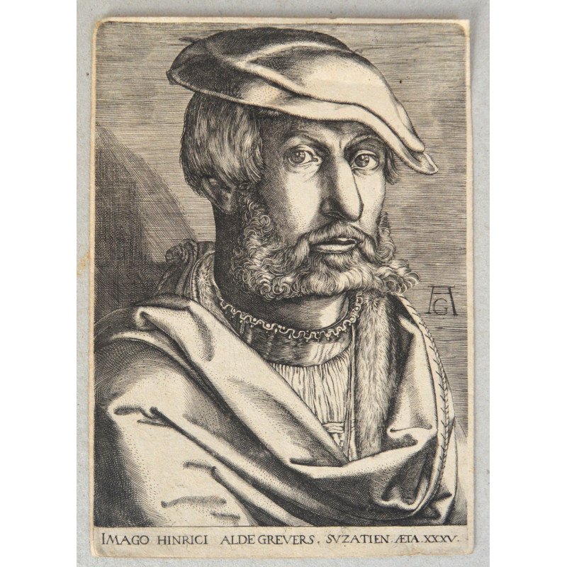 - Inscription content: Signed with Aldegrever's monogram at centre right. Lettered in lower margin: 'IMAGO HINRICI ALDEGREVERS SUZATIEN AETA XXXV'