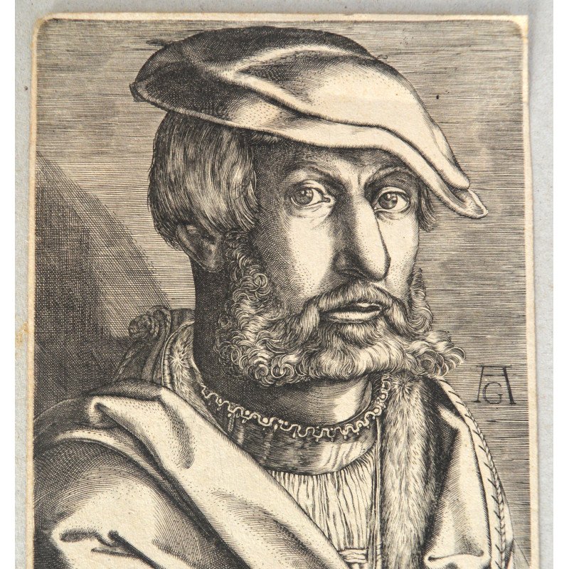 Heinrich Aldegrever "Autoportret" gravura veche 1537-1580.