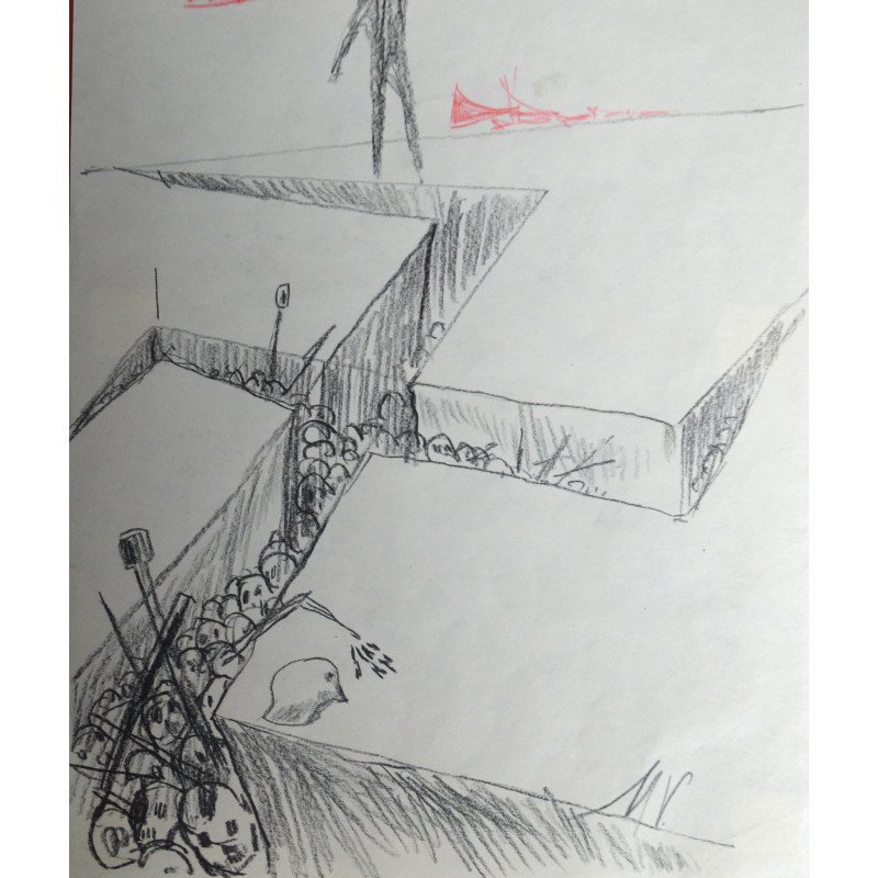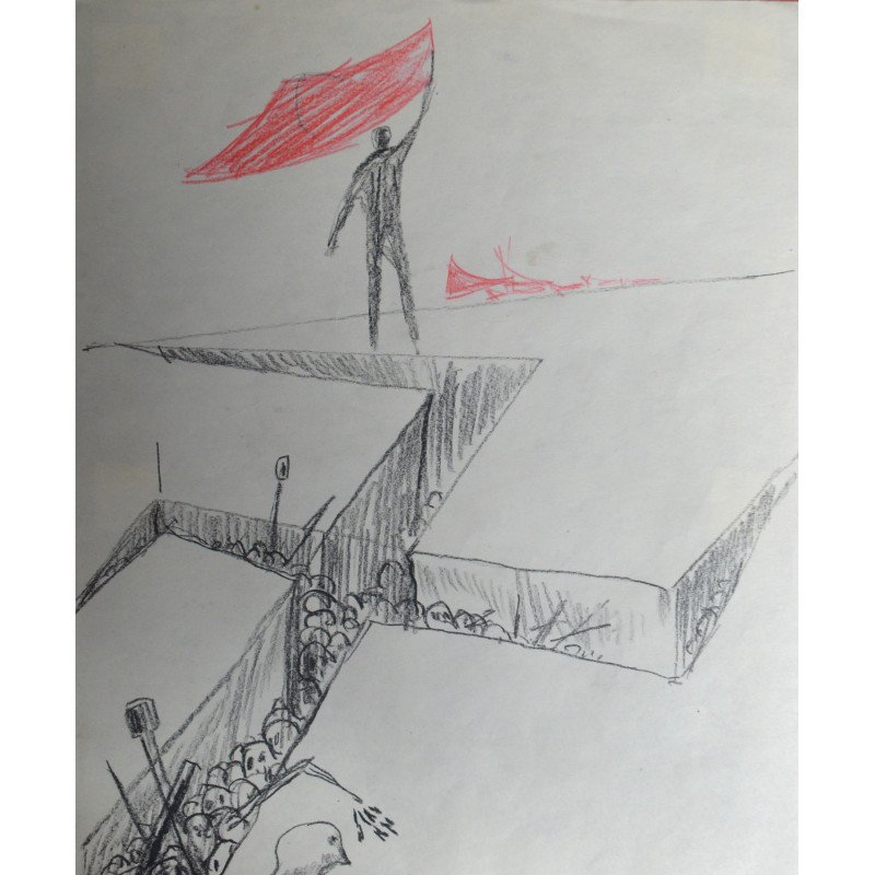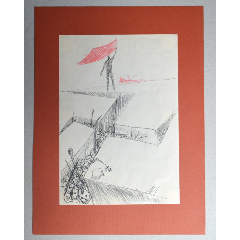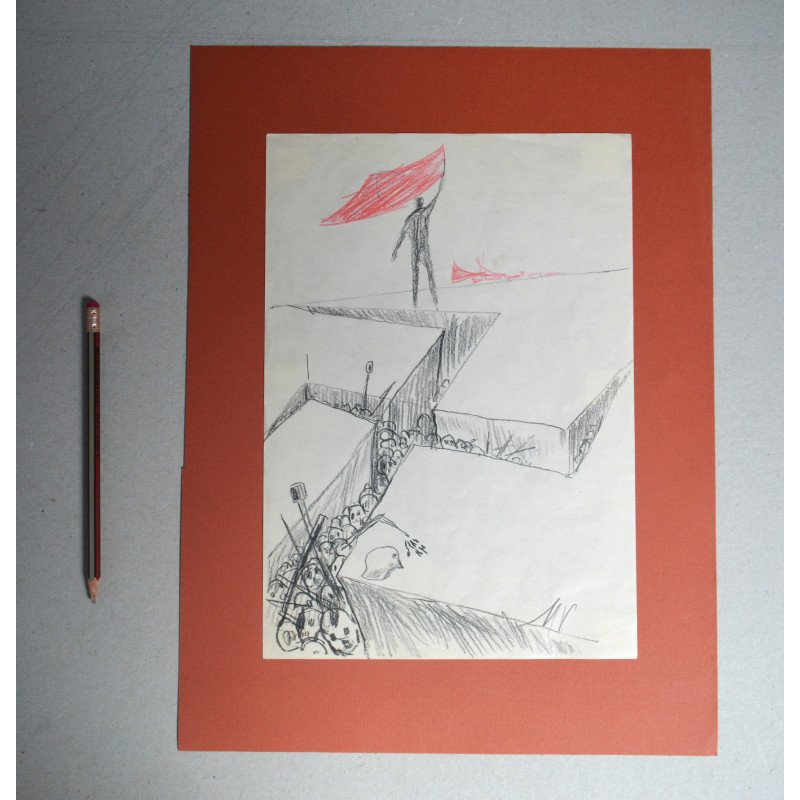 Mihu Vulcanescu "Victoria impotriva fascismului" desen pe hartie fixata pe un suport de carton subtire.