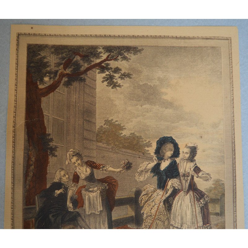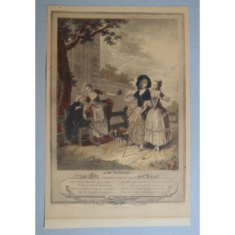 Sigmund Freudenberger "La Promenade du matin" gravura veche publicata de Denis Charles Buldet, Paris, 1774.