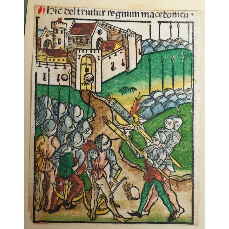 Piesa principală este o scenă reprezentând un oraș medieval asediat, provenind din cronica universală Rudimentum noviciorum, tipărită la Lübeck în 1475 de tipograful Lucas Brandis. Această lucrare se numără printre cele mai importante incunabule ilustrate din Europa de Nord și marchează un moment esențial în dezvoltarea imaginii tipărite.