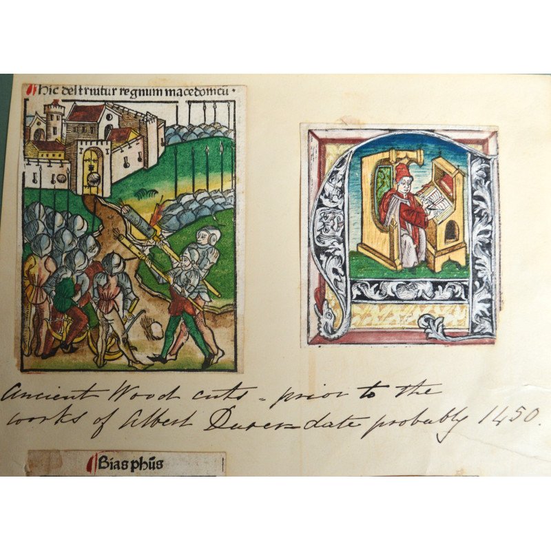 Acest ansamblu reunește patru xilogravuri colorate manual provenind din unele dintre cele mai timpurii cărți tipărite ilustrate din Europa. Gravurile au fost extrase, cel mai probabil în secolul al XIX-lea, și montate pe un suport de hârtie produs mecanic (27 × 22 cm), conform practicilor colecționistice ale epocii. Inscripția manuscrisă în limba engleză, realizată probabil în aceeași perioadă, indică interesul pentru xilogravura timpurie și pentru opera lui Albrecht Dürer ca reper cronologic al istoriei gravurii. Fixarea lor ulterioară pe un suport secundar de hârtie indică o practică colecționistică frecventă în secolele XVIII–XIX, când ilustrațiile erau extrase din volume deteriorate sau incomplete și montate pentru studiu sau expunere.