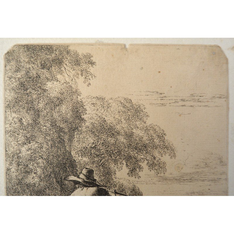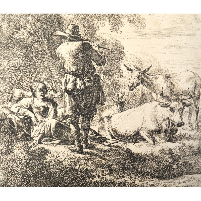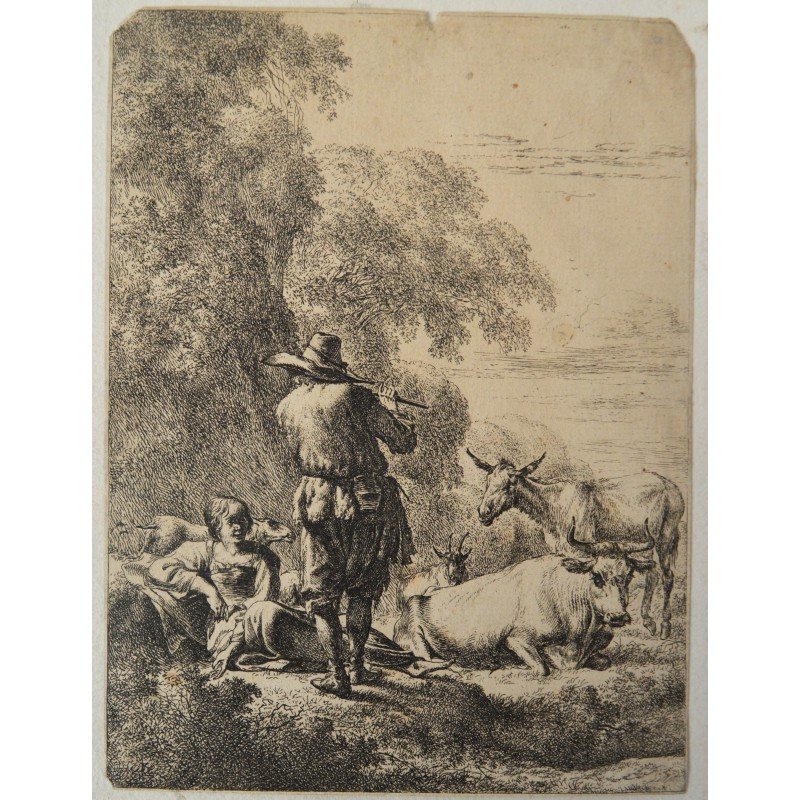 Nicolaes Berchem (1620-1683) "Pastor cantand la flaut" gravura veche 1644-45