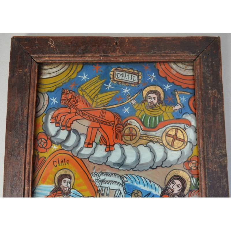 "Sfantul Ilie in carul de foc" icoana pe sticla de Scheii Brasovului sfarsit de secol XIX.