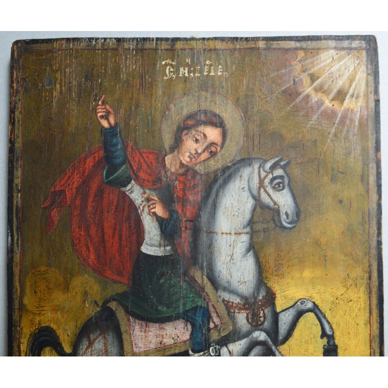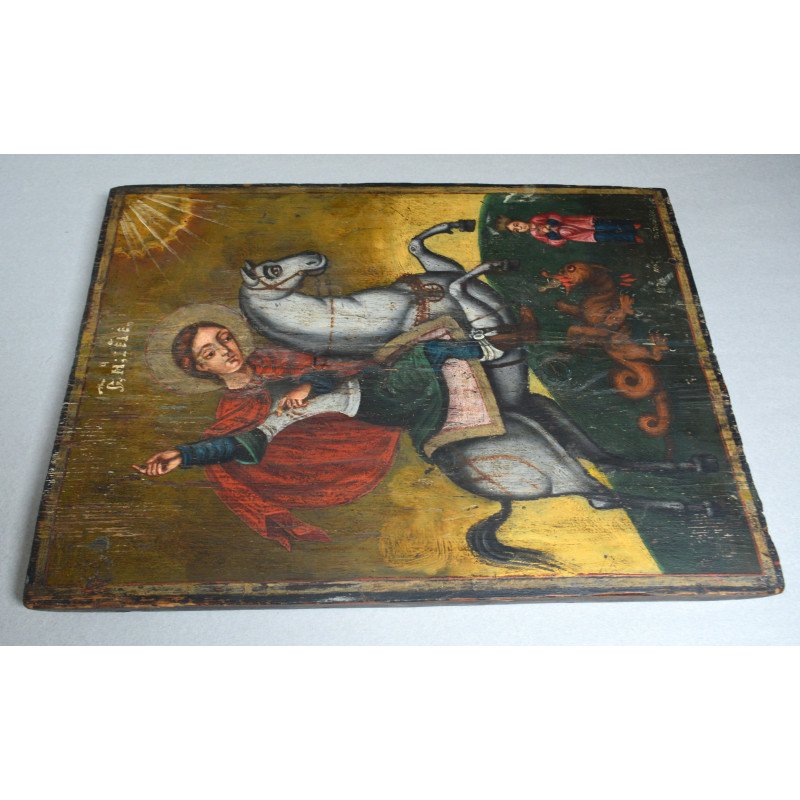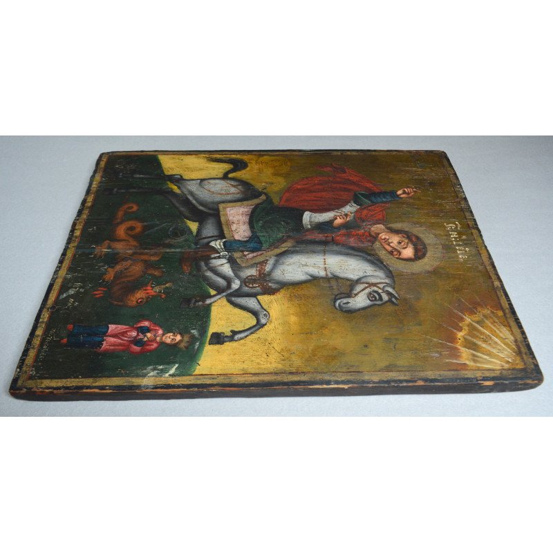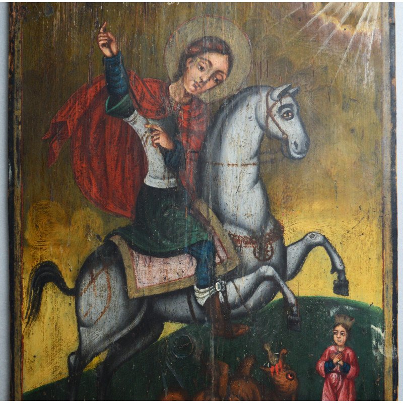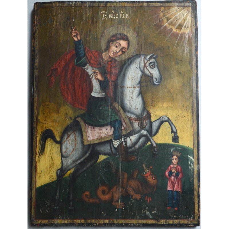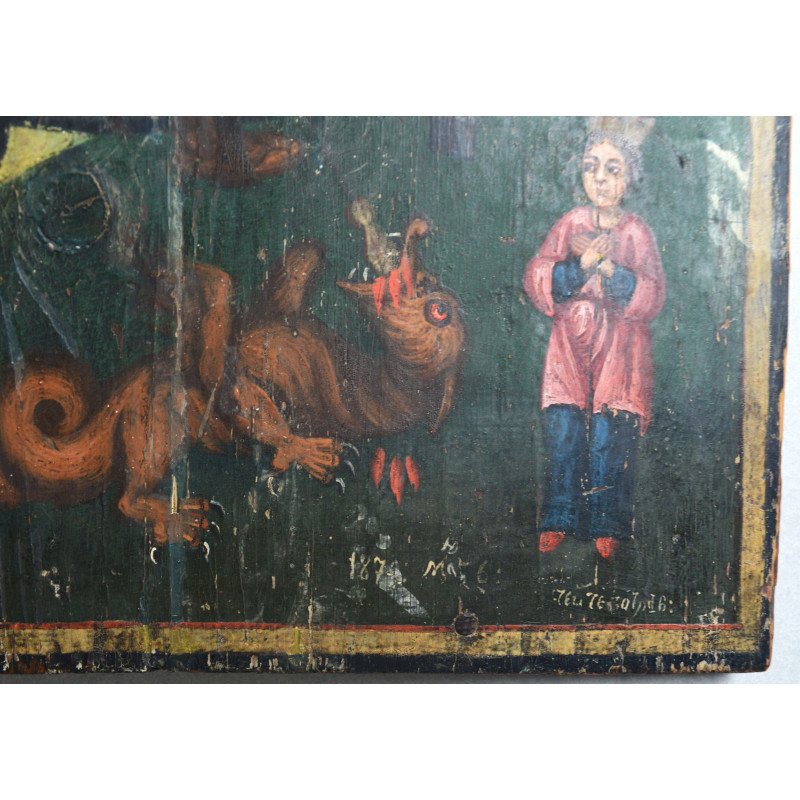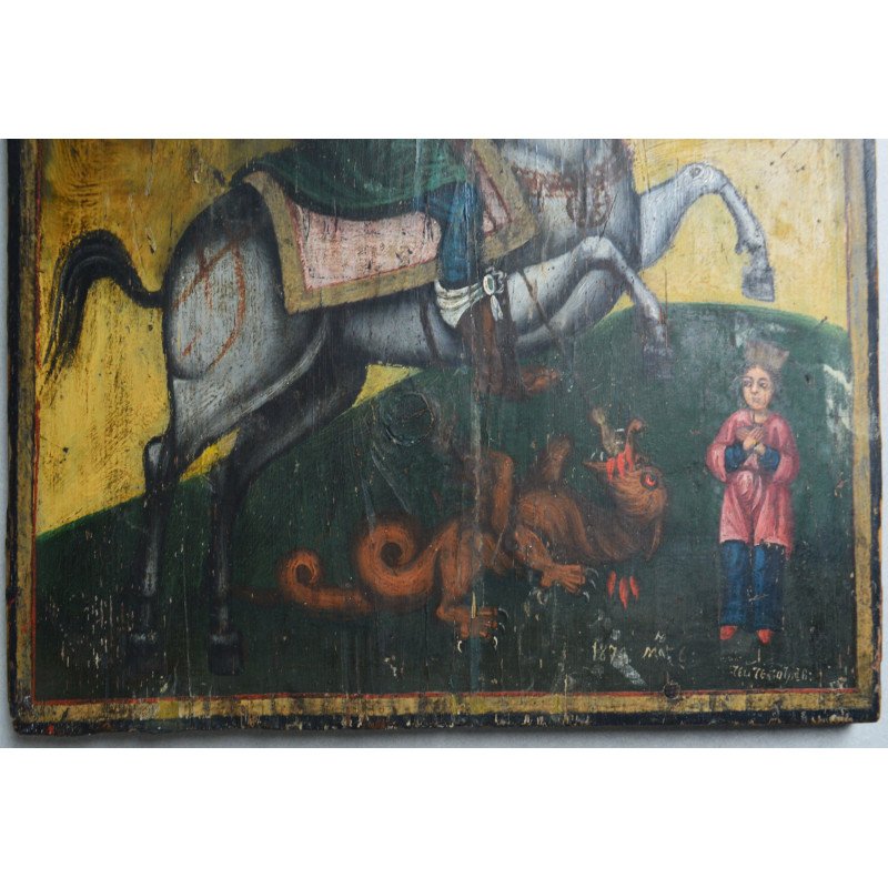 "Sfântul Gheorghe omorând balaurul" icoana pe lemn atelier moldovenesc de factura baroca datata cca. 1871 semnată.