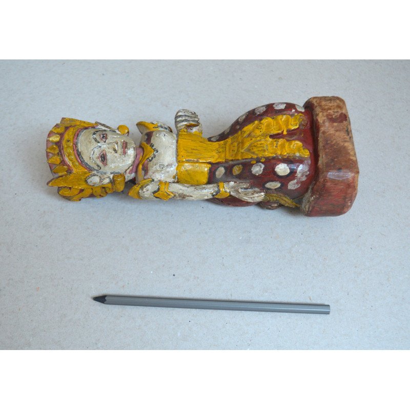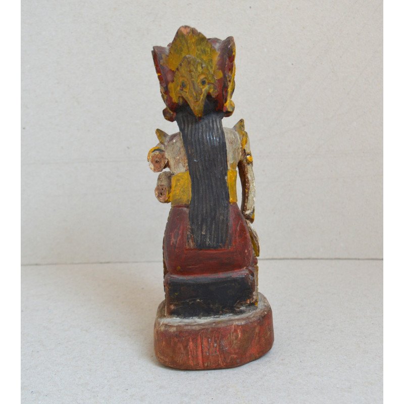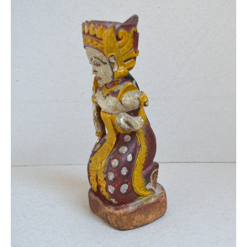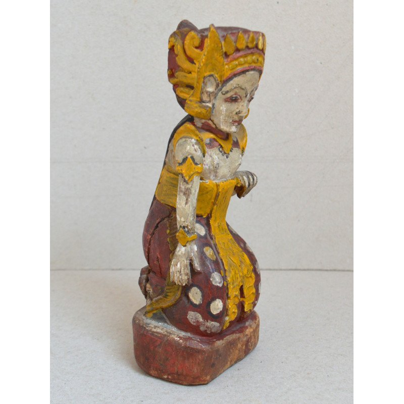Statuetă rituală originară din Bali (Indonezia). Reprezintă un personaj feminin cu trăsături stilizate specifice iconografiei balineze, purtând coroană, bijuterii și o ținută ceremonială decorată cu puncte și registre coloristice simbolice. Obiectul este sculptat din lemn moale și policromat în roșu, galben și alb, cu urme de patină consistentă și uzură accentuată, semn al vechimii și al utilizării religioase.