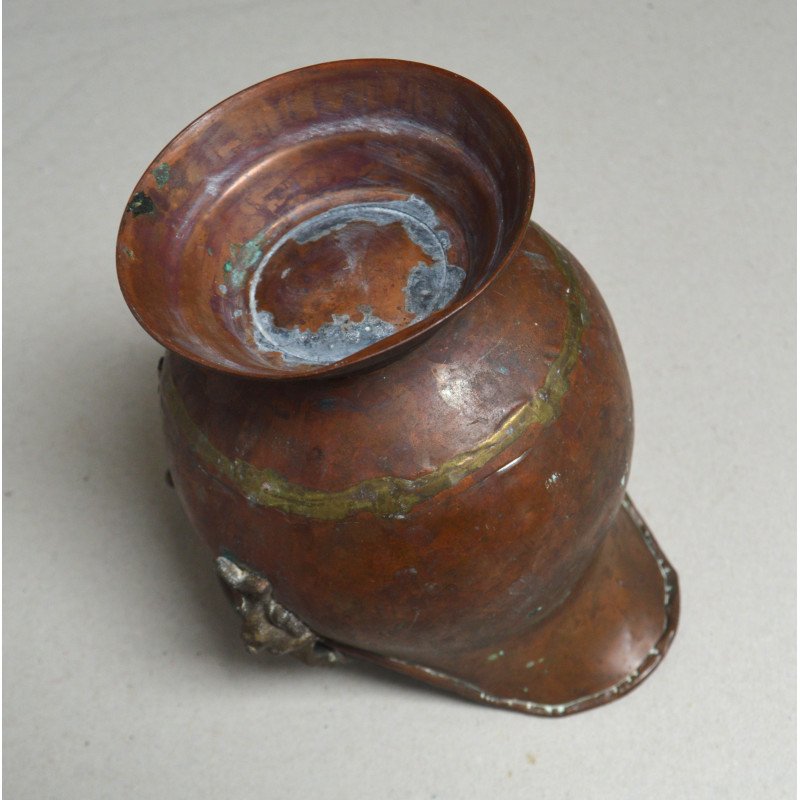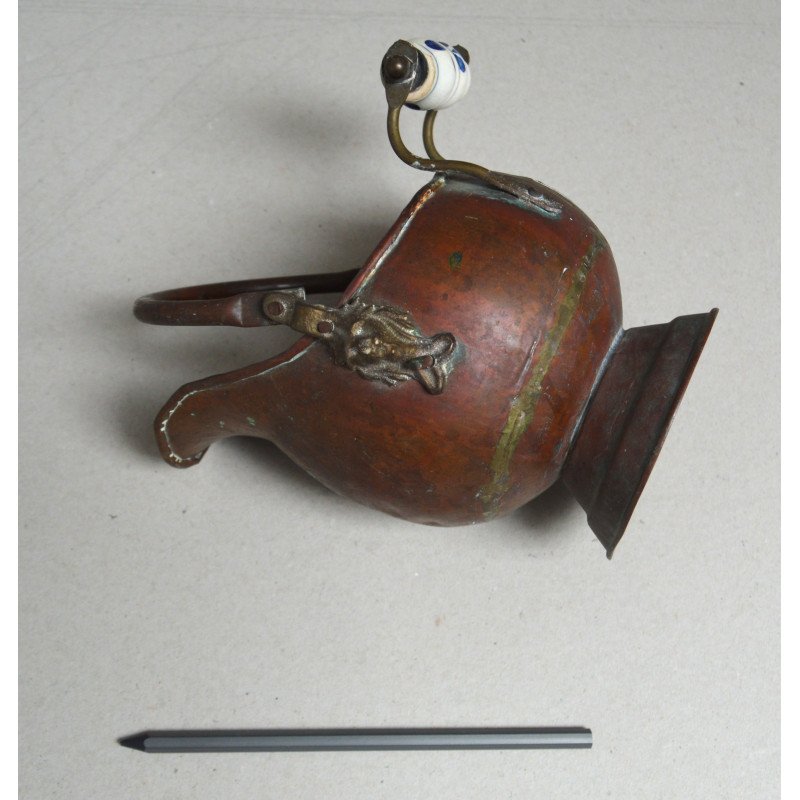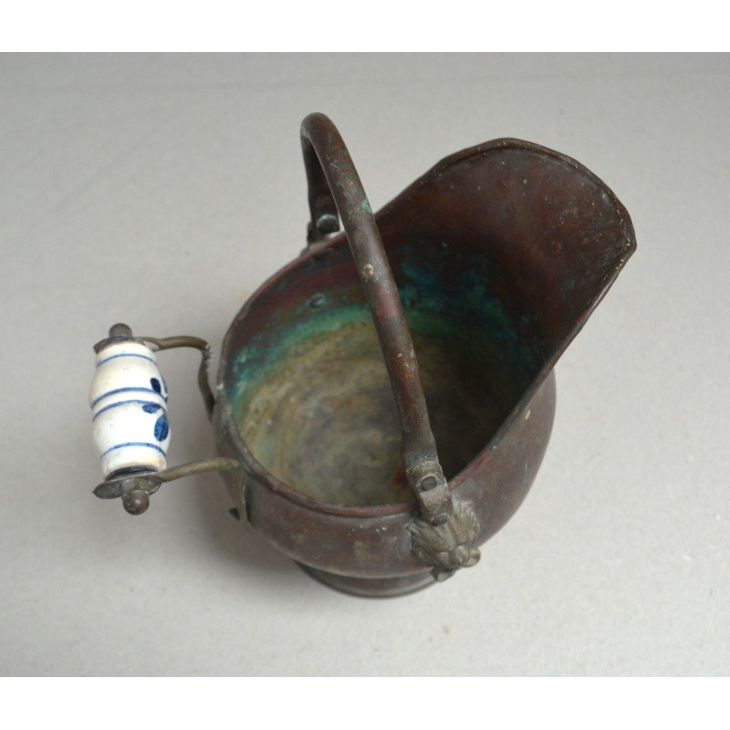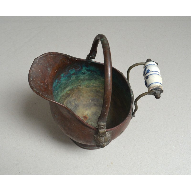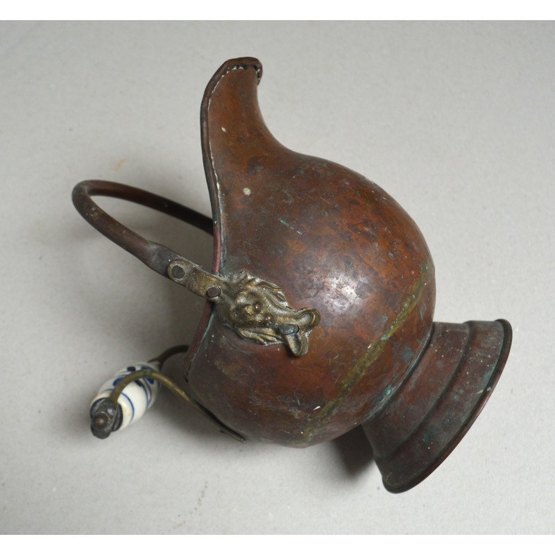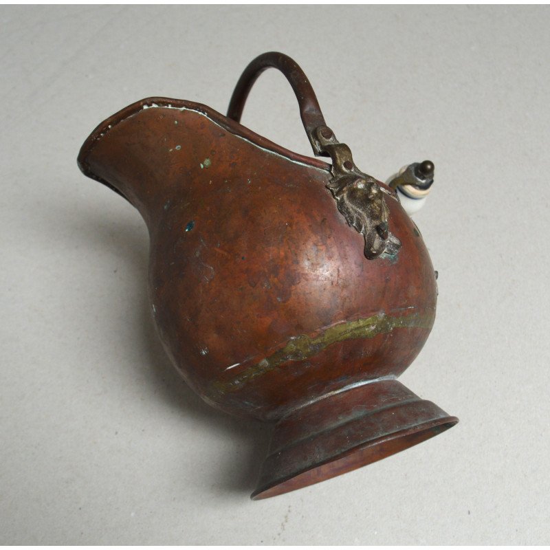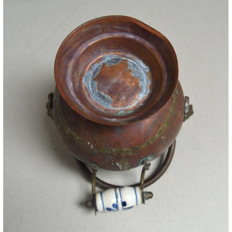 Vas de cupru cu toarta patina naturala, cu doua capete de leu si maner de ceramica.