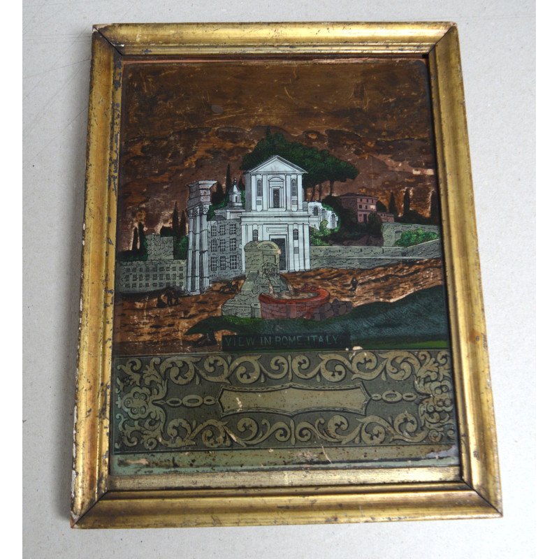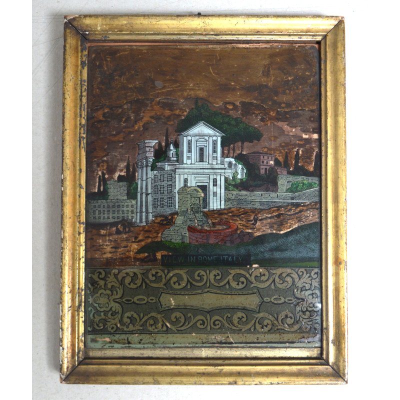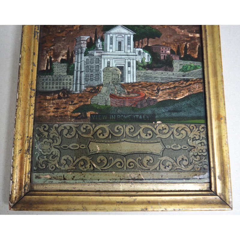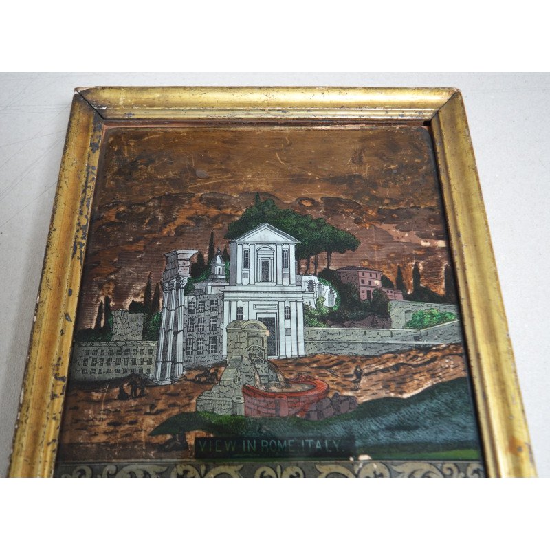 "Vedere din Roma" gravura fixata pe sticla si colorata manual Anglia cca 1800.