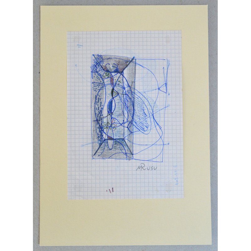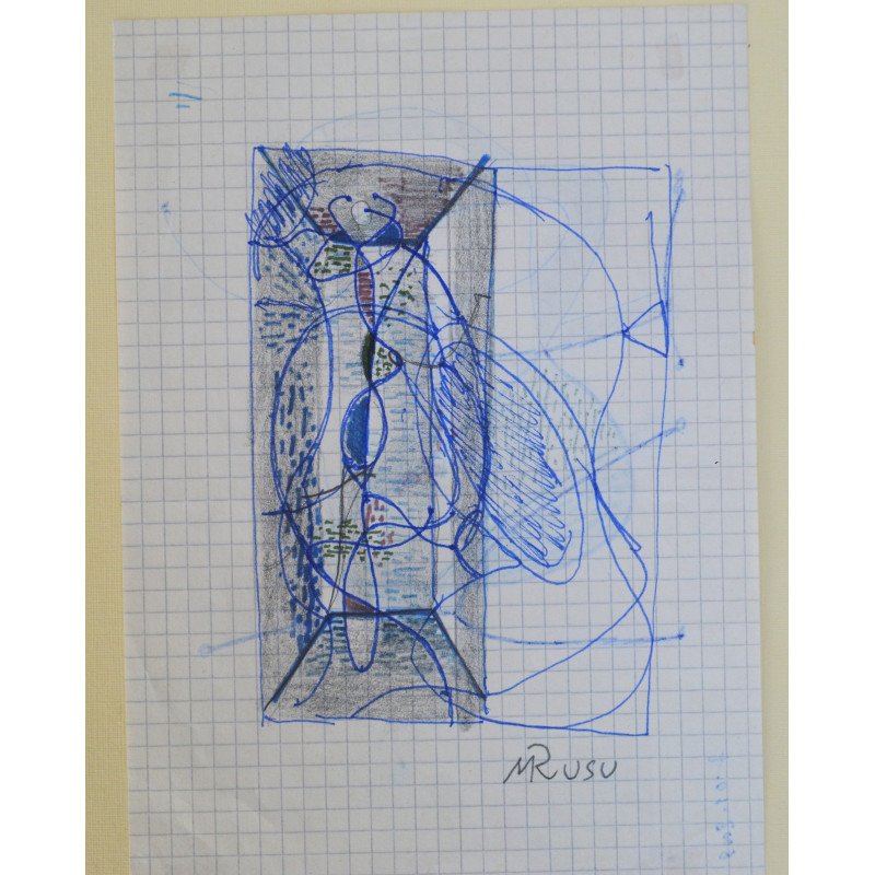 Mihai Rusu desen tehnica mixta pe hartie cu patratele fixata pe un suport de carton.