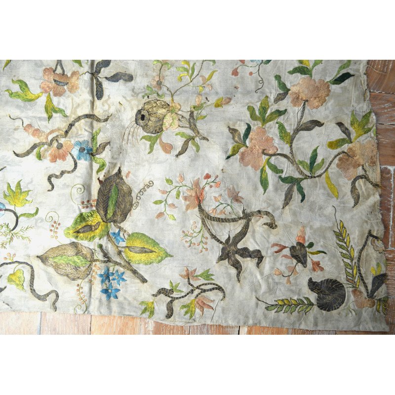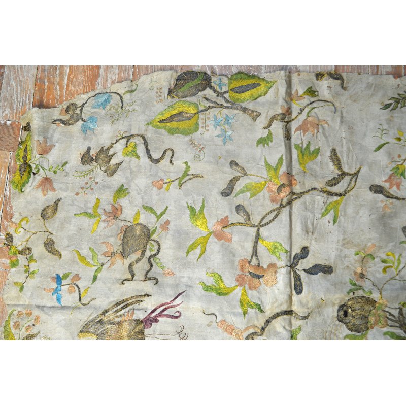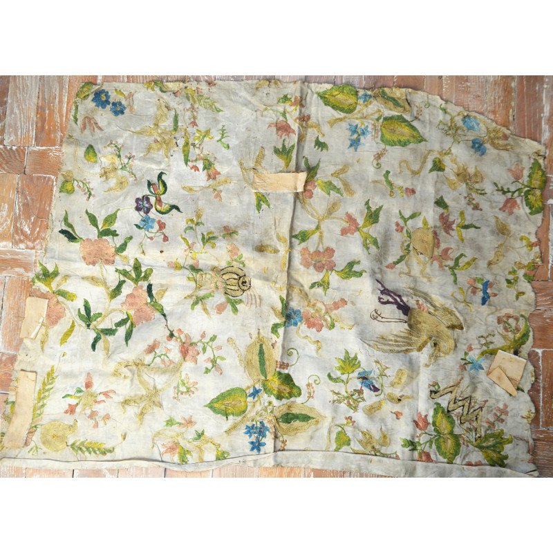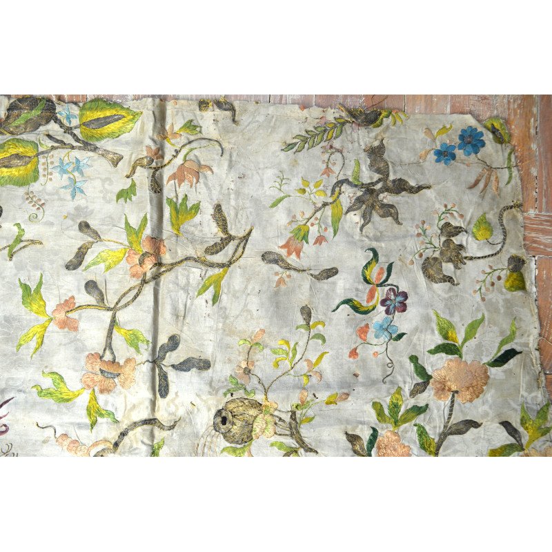 Obiectul este un fragment textil brodat, databil stilistic în prima jumătate a secolului al XVIII-lea, provenind, cel mai probabil, din Franța sau Portugalia. Lucrarea prezintă o broderie elaborată cu fire metalice (argint parțial aurit) și mătase policromă pe un suport din in sau bumbac fin. Suprafața brodată, cu dimensiuni aproximative de 80 x 60 cm, păstrează un repertoriu decorativ vegetal și zoomorf, executat cu precizie și diversitate cromatică remarcabilă, în pofida uzurii.