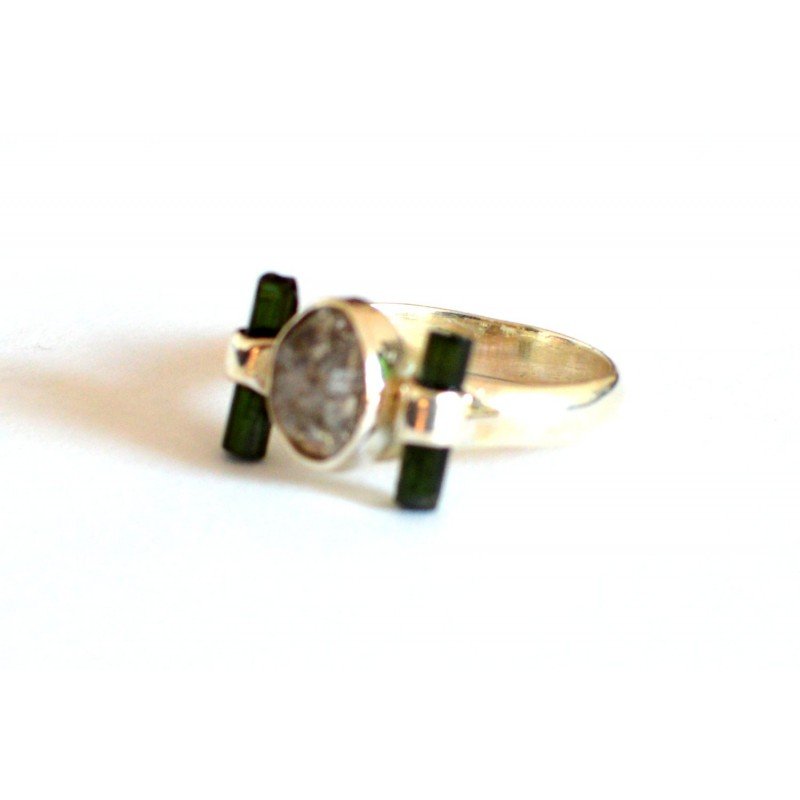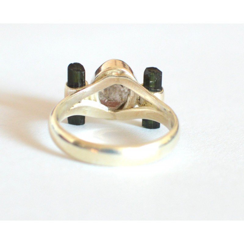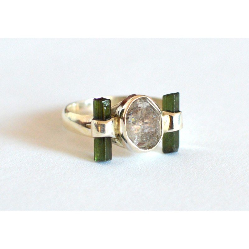 Inel argint cu pietre naturale turmalina verde si cuart herkimer. Marcaj 925