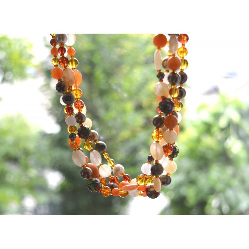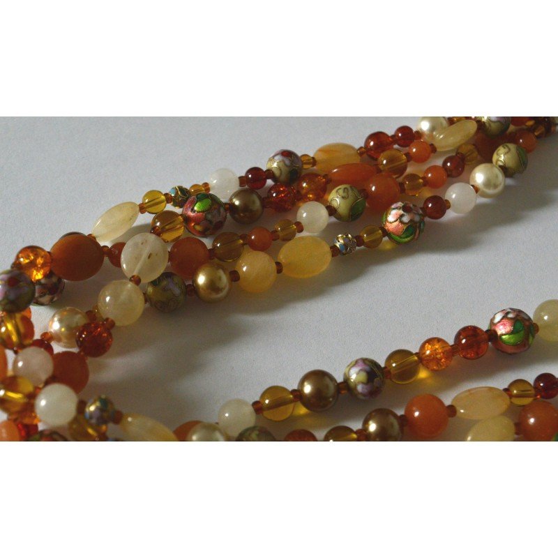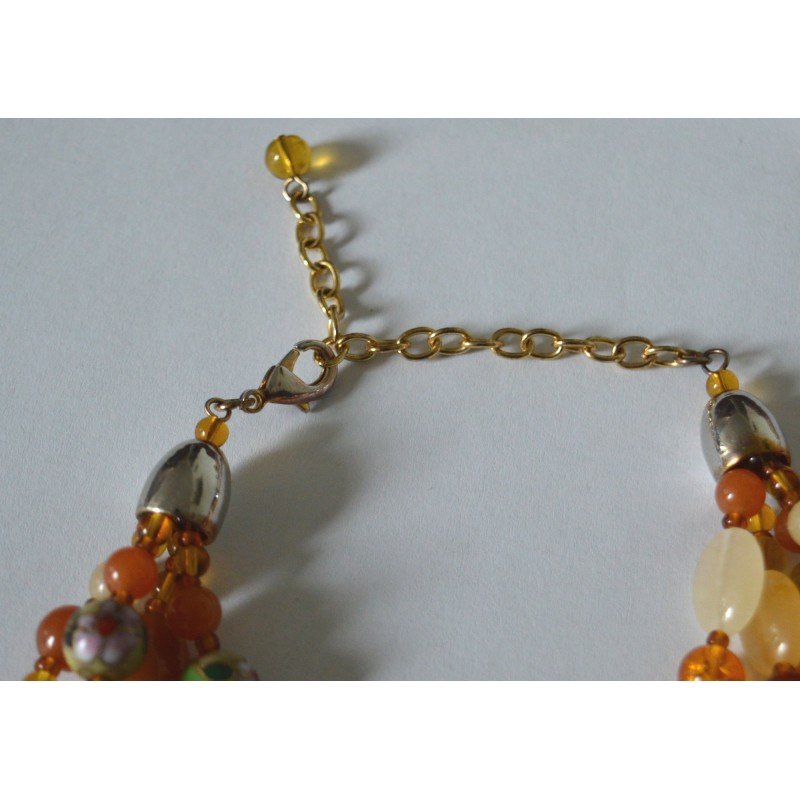 Colier vintage masiv 4 randuri margele pietre naturale, cloisonne si imitatii de perle si chihlimbar